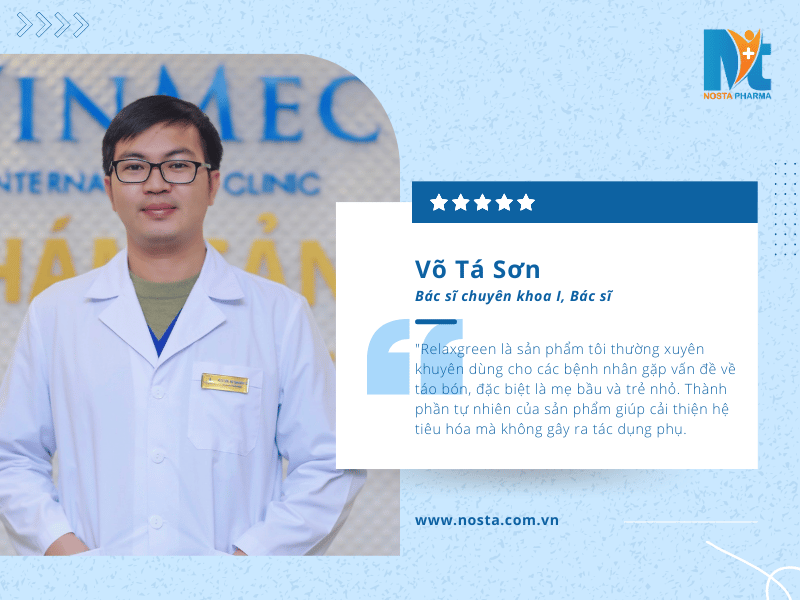 Bác sĩ Võ Tá Sơn - Bác sĩ Y học bào thai, Trung tâm Sức khỏe Phụ nữ, Bệnh viện ĐKQT Vinmec Times City, cho biết: "Relaxgreen là sản phẩm tôi thường xuyên khuyên dùng cho các bệnh nhân gặp vấn đề về táo bón, đặc biệt là mẹ bầu và trẻ nhỏ. Thành phần tự nhiên của sản phẩm giúp cải thiện hệ tiêu hóa mà không gây ra tác dụng phụ."